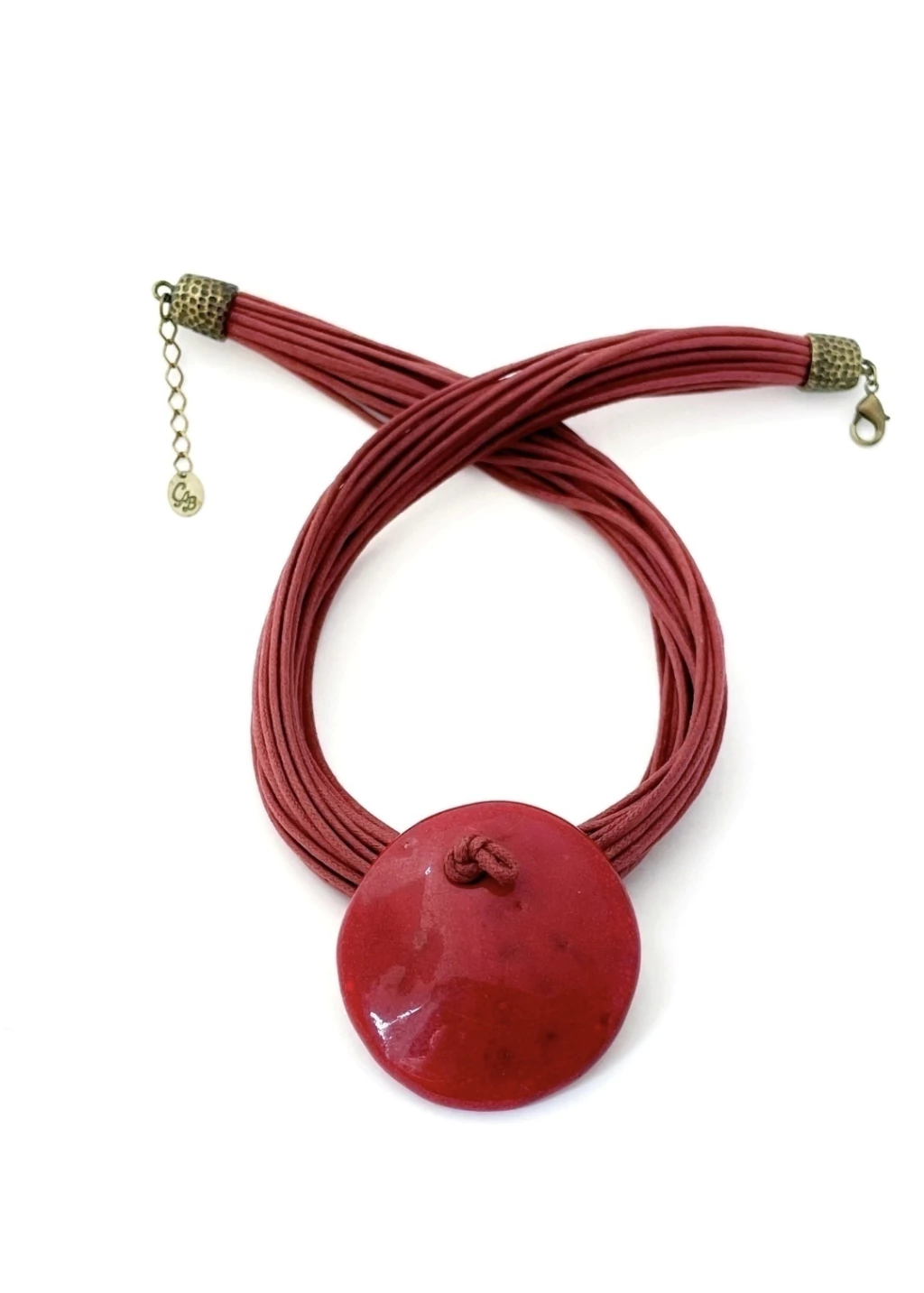 Adicione um toque de sofisticação ao seu estilo. Este colar é feito à mão, comum design elegante em cerâmica na cor vermelho, que se destaca pela sua beleza única e contemporânea.