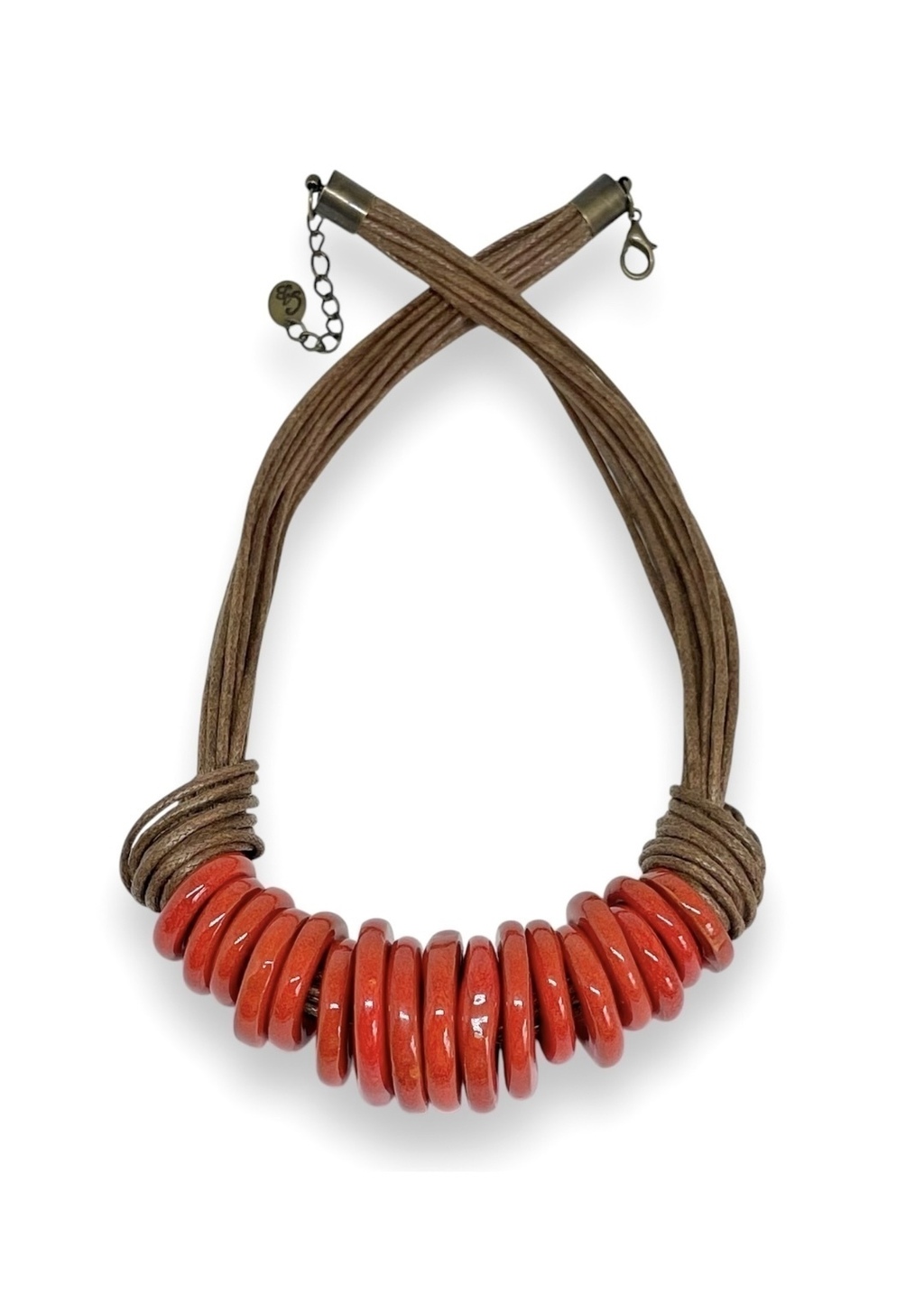 Este colar é feito com contas de cerâmica na cor laranja, realçado por um cordão encerado na cor marrom. Com um comprimento aproximado de 48cm, ele possui uma correntinha de prolongamento, permitindo um ajuste perfeito.