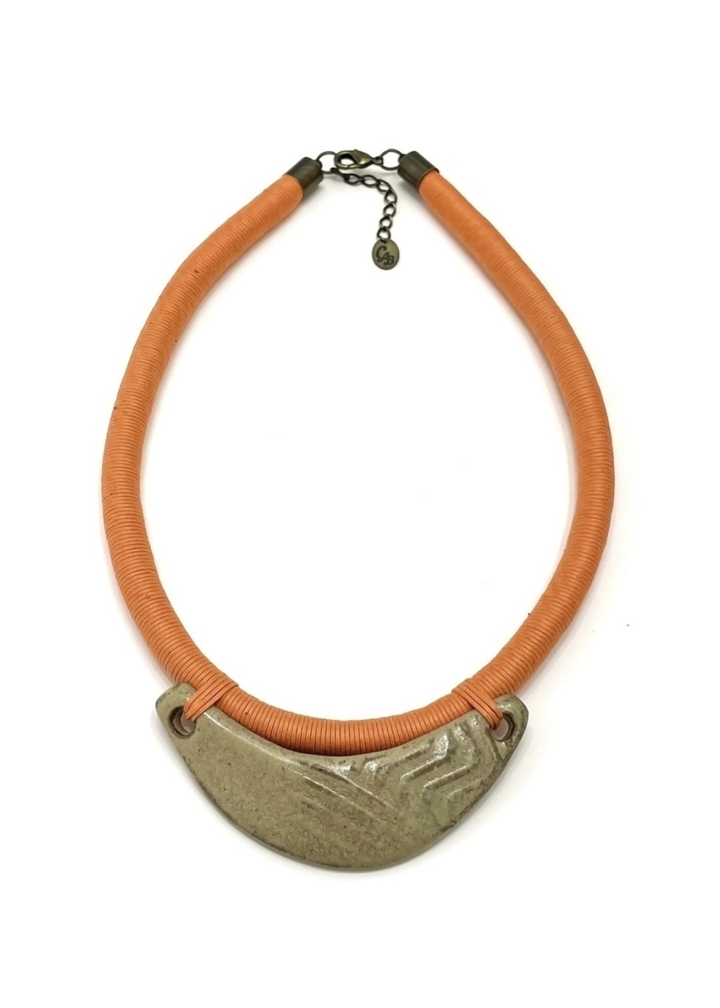 Colar feito a mão com cordão de algodão enrolado na cor laranja e pingente de cerâmica na queima de alta temperatura.