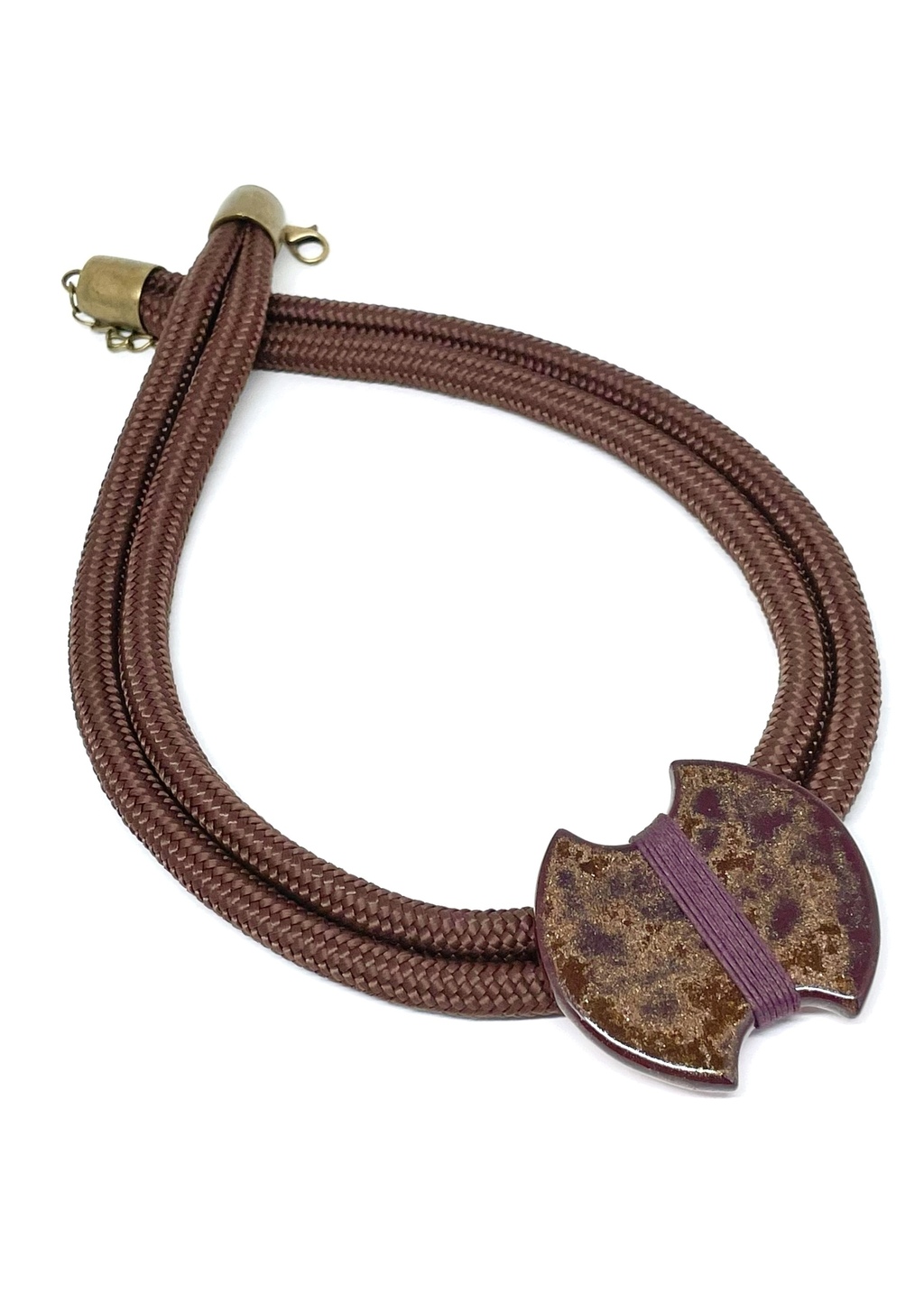 Produzido artesanalmente em corda nautica na cor marrom e cerâmica com forma única e acabamento impecável na cor marrom com detalhes próprios do esmalte com um brilho em tons de cobre. A peça em cerâmica é moldada e esmaltada manualmente, o que garante nuances exclusivas de cor e textura que nunca se repetem de forma idêntica.