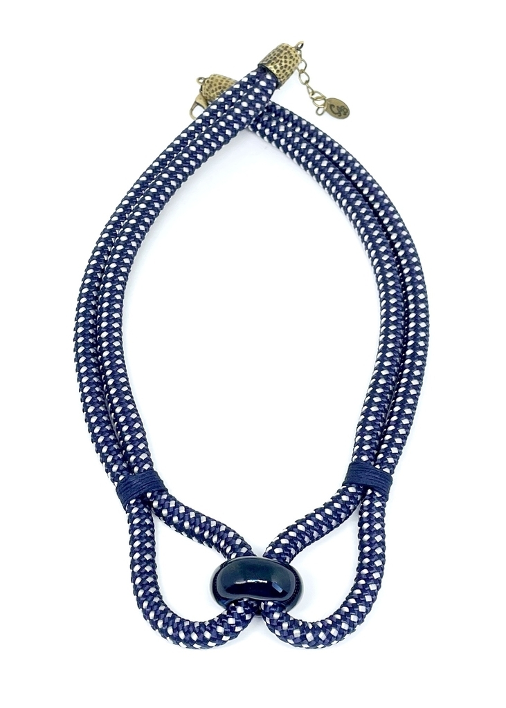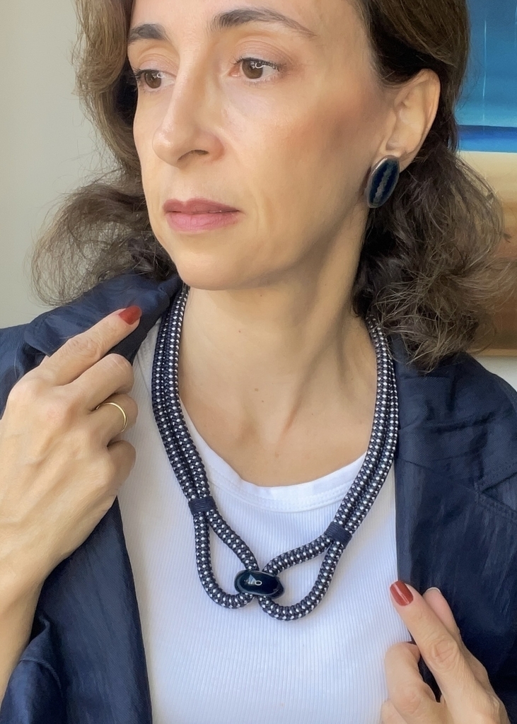 Feito artesanalmente, ele une a força da corda náutica no estilo poá cor azul/ branco — um padrão que agrega charme e movimento visual à peça. O destaque fica por conta da peça central em cerâmica na cor azul escuro que combina perfeitamente com as demais cores dos materiais, moldada e esmaltada à mão, o que torna cada colar absolutamente único em textura, cor e acabamento.
